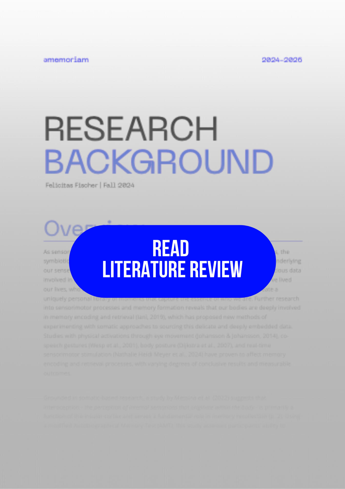 Embodiment in episodic memory through pre-motor hippocampal coupling (Nathalie Heidi Meyer, et. al. 2024)The role of bodily self-consciousness in episodic memory of naturalistic events: an immersive virtual reality study (Sylvain Penaud, Yeh, D., Alexandre Gaston-Bellegarde, & Pascale Piolino. 2023)Exploring the role of interoception in autobiographical memory recollection (Messina, A., Basilico, S., Bottini, G., & Salvato, G. 2022)Embodied Memories: Reviewing the role of the body in memory processes (Ianì, F. 2019)Assessing body awareness and autonomic reactivity: Factor structure and psychometric properties of the Body Perception Questionnaire‐Short Form (Cabrera, A., et. al., Porges, S. W. 2018)Embodied Knowledge - Embodied Memory (Fuchs, T. 2016)Look Here: Eye movement play a functional role in memory retrieval (Johansson, R., & Johansson, M. 2013)Gestures Maintain Spatial Imagery (Wesp, R., Hesse, J., Keutmann, D., & Wheaton, K. 2001)